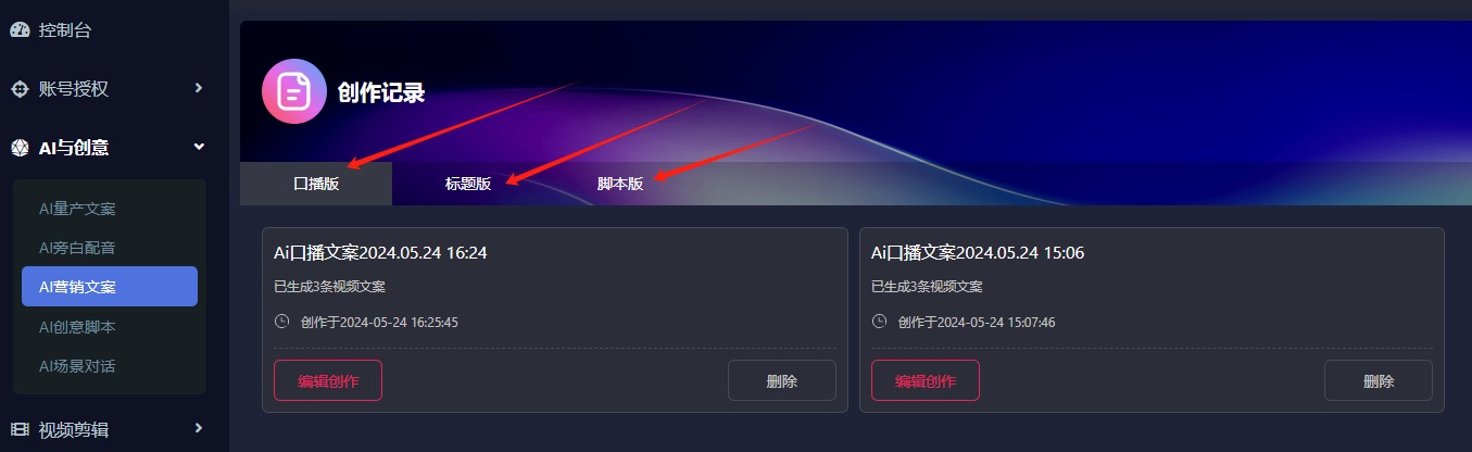 无论是口播文案,标题文案,还是视频拍摄脚本,系统都可以帮助您智能生成