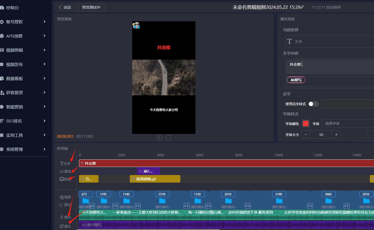 通过系统的可视化剪辑,可以插入文字标题、音效、贴纸、口播旁白、音乐等,一键批量生成多条视频,大大节省剪辑视频时间。